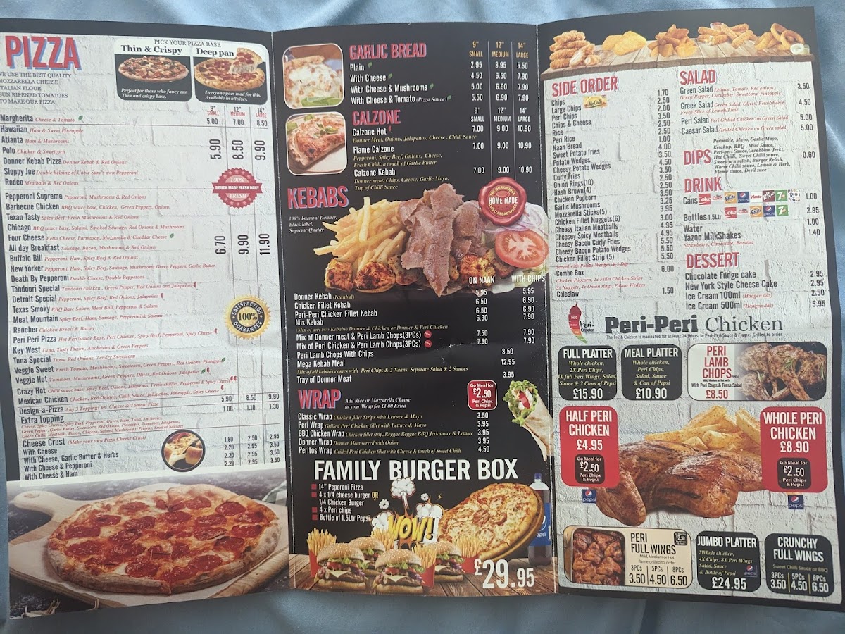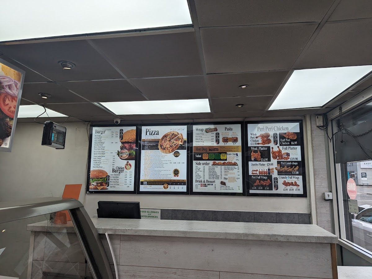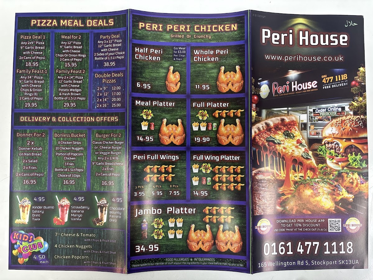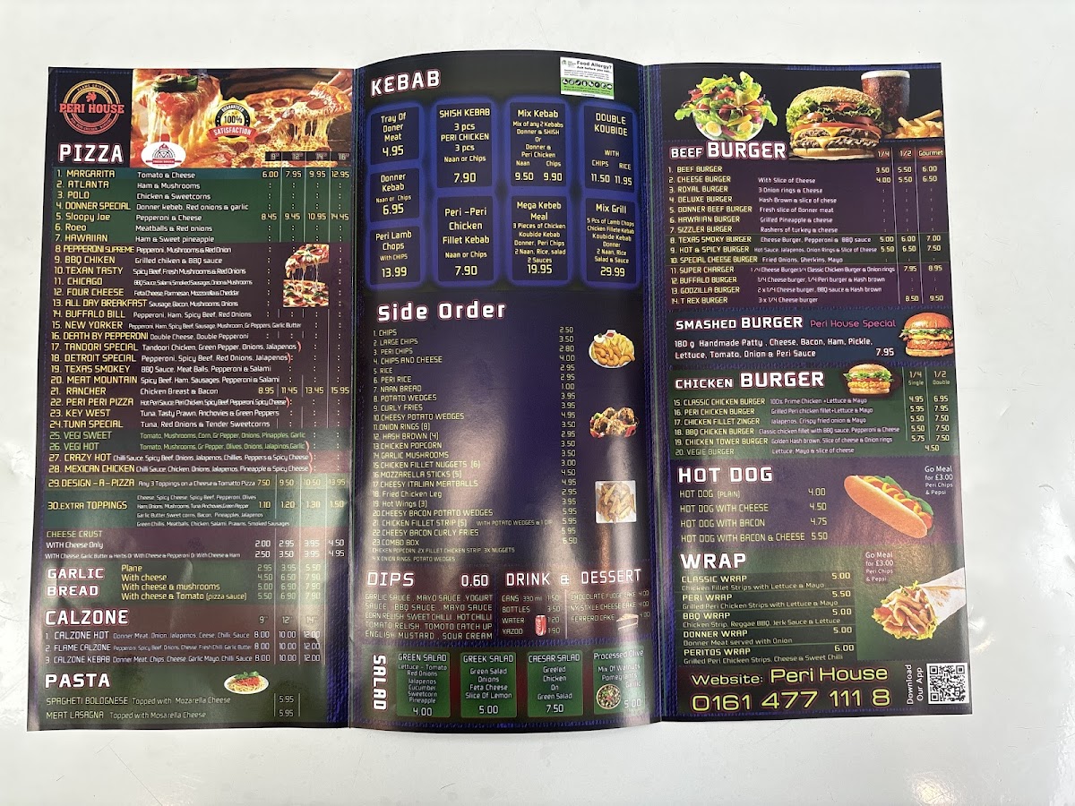 From a reviewer’s perspective, the menu at Peri House offers a broad and satisfying selection that caters to a variety of tastes, even though specific prices aren’t listed. The pizza range stands out with options like Detroit Special, Texas Smoky BBQ, Margherita, Hawaiian, and Atlanta, while the garlic bread choices-Plain, With Cheese, and With Cheese & Mushrooms-make for simple yet appealing starters. Sides such as Chips, Large Chips, Peri Chips, and Rice complement mains well, alongside fresh options like Greek Salad and Caesar Salad. The hearty offerings continue with calzones like Calzone Hot and Flame Calzone, plus wraps including Classic Wrap and BBQ Chicken Wrap. The highlight is clearly the peri-peri section, featuring Full Platter, Half Peri Chicken, and Peri Lamb Chops, which deliver bold, grilled flavors. Burger lovers can enjoy Royal Burger or Deluxe Burger, while kebab choices like Donner Kebab and Mix Kebab add further variety. With meal deals such as Family Feast 1 and Party Deal, plus kid-friendly picks like Chicken Popcorn, the menu feels both versatile and crowd-pleasing, making Peri House a reliable spot for casual, flavor-packed dining.
